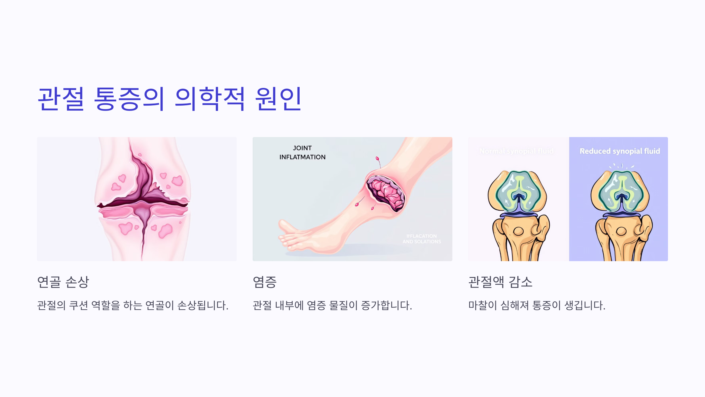 관절 통증은 대부분 연골 손상과 염증에서 시작돼요. 연골은 관절 사이에서 쿠션 역할을 해 마찰을 줄여주지만,