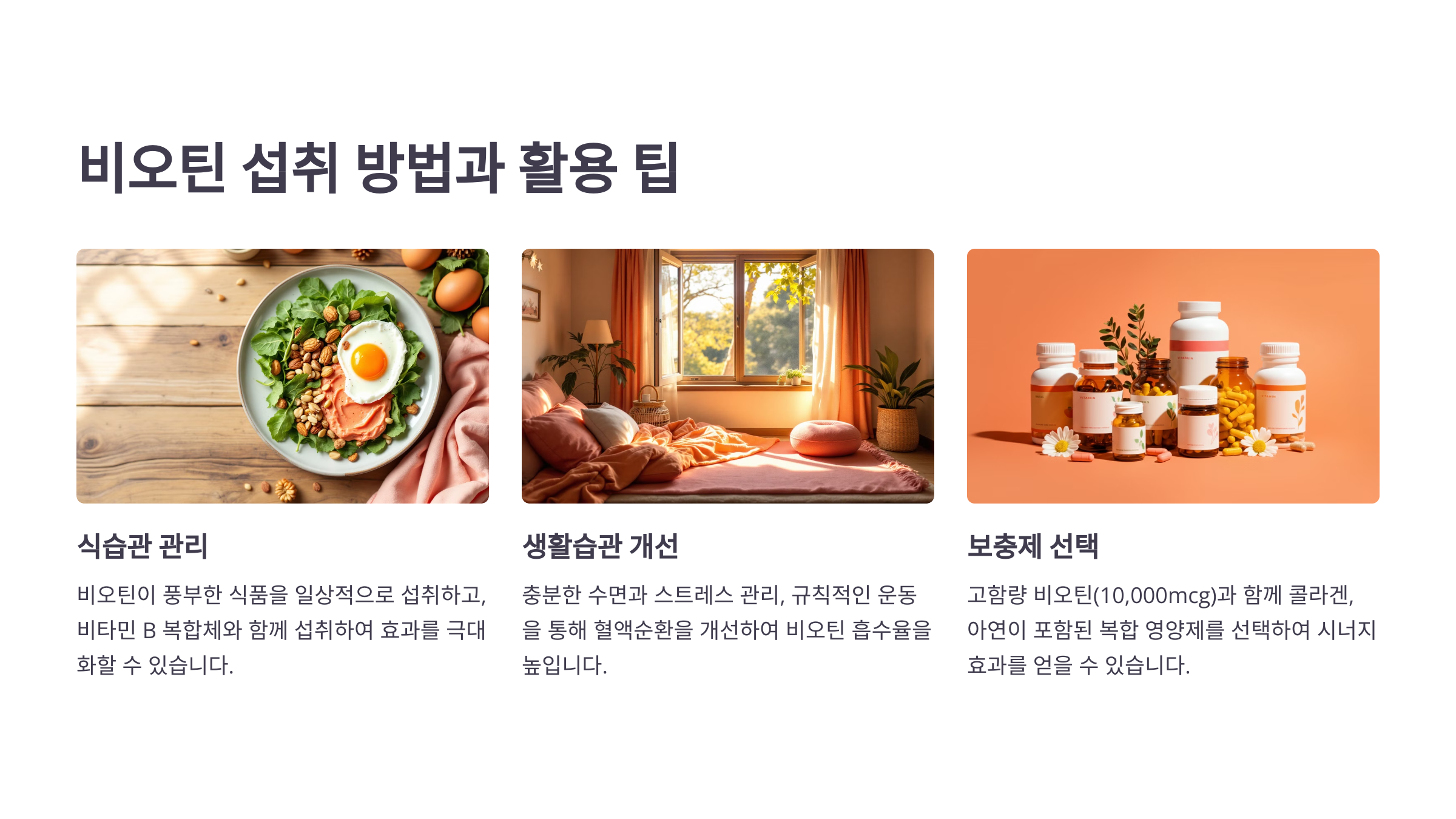 비오틴의 효능을 최대로 끌어올리려면 식습관과 생활습관 관리가 필수예요.