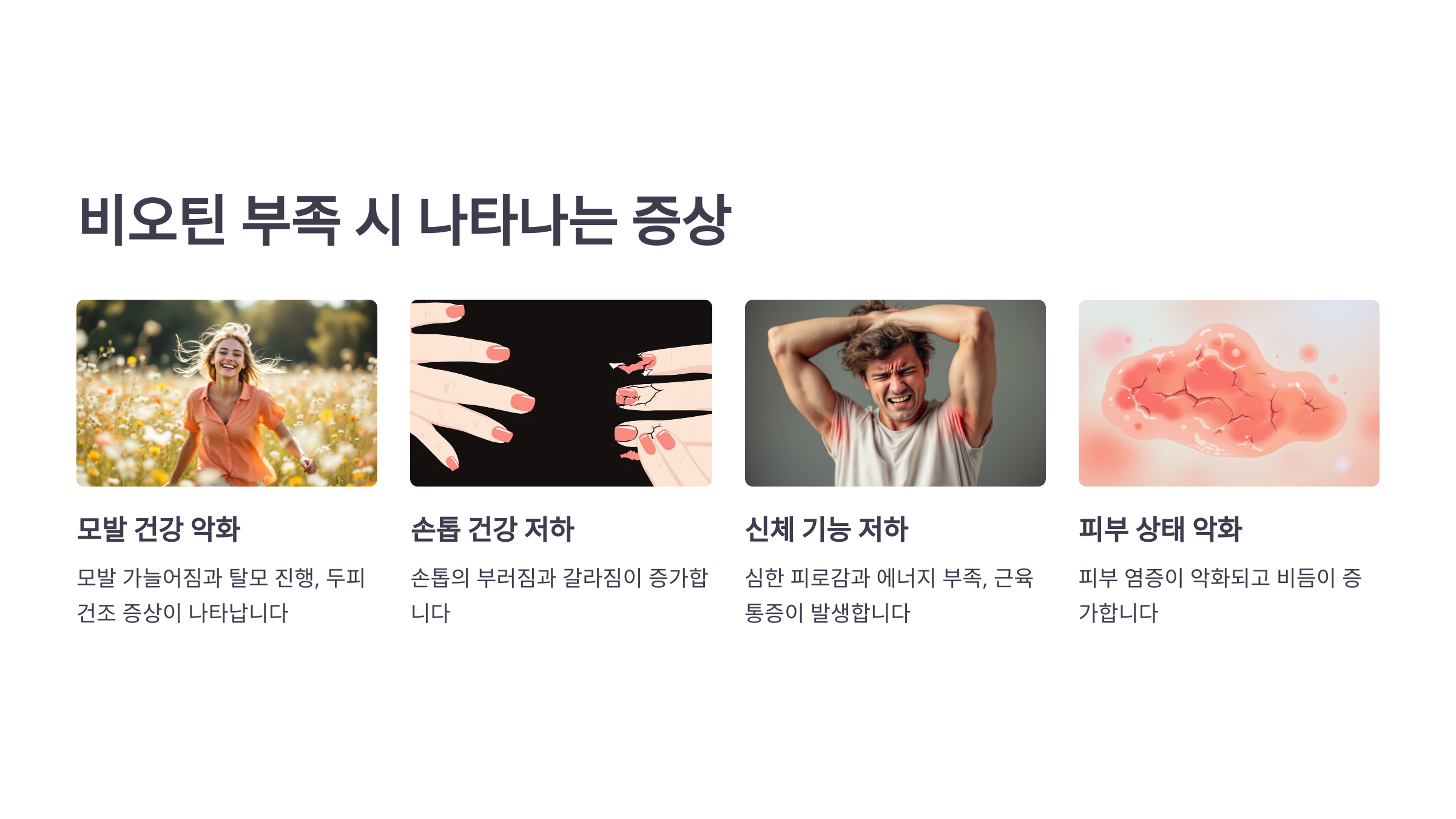 비오틴이 부족하면 다양한 증상이 나타나는데, 이를 방치하면 증상이 악화될 수 있어요.
